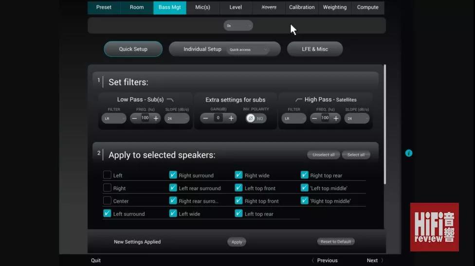 ▲ 除了為每個聲道設置分頻點,還可以為每個聲道設置 Low Pass 或 High Pass 濾波,換句話說,哪管你是聯合國環繞聲系統,它也有能力把不同特性的揚聲器差異盡量收窄。