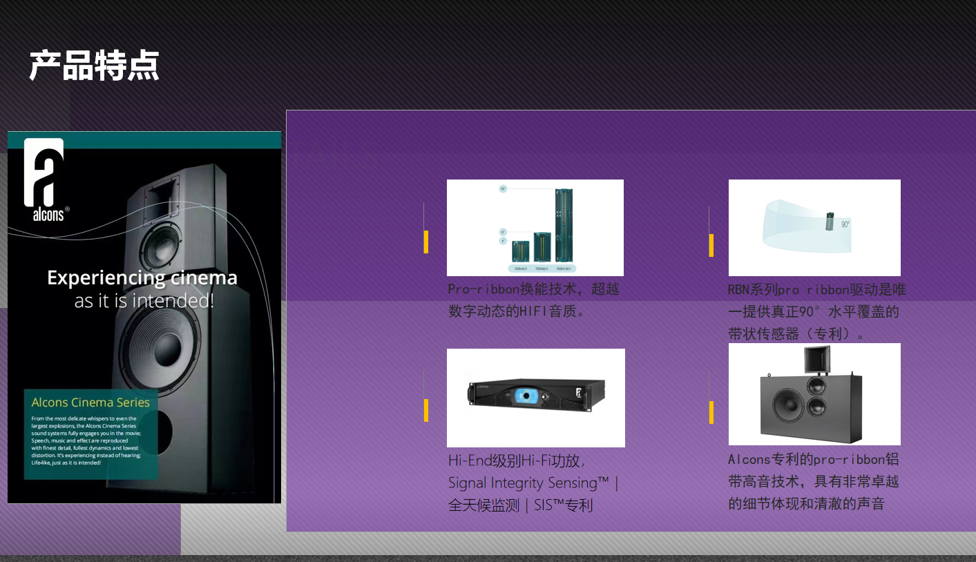 Alcons專利的pro-ribbon鋁帶高音技術(shù),具有非常卓越的細(xì)節(jié)體現(xiàn)和清澈的聲音,無論是動(dòng)態(tài)范圍還是聲壓值,都比壓縮驅(qū)動(dòng)號(hào)角優(yōu)秀,Pro-ribbon專利技術(shù),能夠不壓縮1:1還原電影原聲。