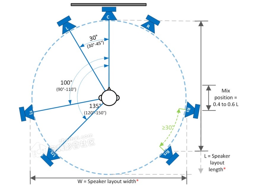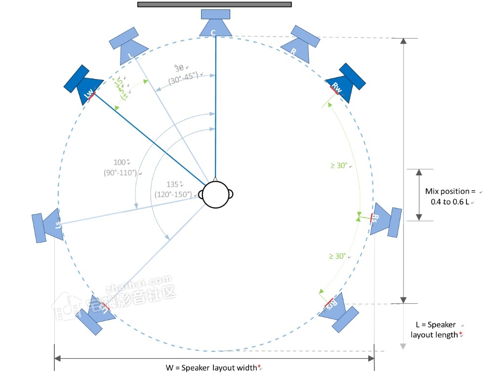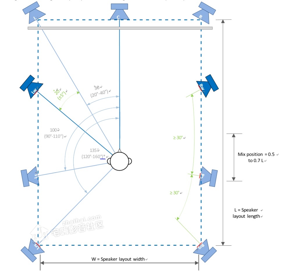 在擴(kuò)大結(jié)構(gòu)時(shí),可以增加多達(dá)四個(gè)揚(yáng)聲器選項(xiàng): 增寬揚(yáng)聲器 側(cè)面環(huán)抱陣列 后環(huán)抱陣列 附加的頂部環(huán)抱揚(yáng)聲器或頂部環(huán)抱陣列 您可以相互自力地?cái)[設(shè)揚(yáng)聲器選項(xiàng),而且可以將一切擴(kuò)大結(jié)構(gòu)選項(xiàng)利用于等距或正交結(jié)構(gòu)。 在設(shè)想擴(kuò)大結(jié)構(gòu)之前,請(qǐng)先優(yōu)化基座7.1.4結(jié)構(gòu),以合適揚(yáng)聲器結(jié)構(gòu)設(shè)想的指導(dǎo)原則。完成根基優(yōu)化后,可以斟酌擴(kuò)大結(jié)構(gòu)及其指導(dǎo)原則。 5、增寬音箱 您可以在7.1.4結(jié)構(gòu)中增加增寬環(huán)抱揚(yáng)聲器,以建立9.1.4揚(yáng)聲器結(jié)構(gòu)。在9.1.4杜比全景聲設(shè)備中,有六個(gè)標(biāo)準(zhǔn)平面環(huán)抱揚(yáng)聲器。建立9.1.4結(jié)構(gòu)的附加揚(yáng)聲器為左寬(Lw)和右寬(Rw)。 兩個(gè)首要的設(shè)想方面安排著增寬環(huán)抱聲揚(yáng)聲器的位置: 水平角度放置和相鄰揚(yáng)聲器之間的角度間隔 所需的增寬環(huán)抱揚(yáng)聲器仰角,與混音位置成一定角度 增寬環(huán)抱聲揚(yáng)聲器應(yīng)與其他環(huán)抱聲揚(yáng)聲器音調(diào)類似,并合適所需的聲壓級(jí)別(SPL)標(biāo)準(zhǔn)。 6、增寬環(huán)抱式揚(yáng)聲器水平角度 利用增寬環(huán)抱揚(yáng)聲器時(shí),要斟酌房間設(shè)想、揚(yáng)聲器位置和結(jié)構(gòu)范例,以到達(dá)適當(dāng)?shù)乃浇嵌取?br style="overflow-wrap:break-word;" /> 利用增寬環(huán)抱聲揚(yáng)聲器時(shí),以下原則適用: 在挑選增寬環(huán)抱揚(yáng)聲器的位置之前,請(qǐng)回首屏幕、側(cè)面環(huán)抱、后部環(huán)抱和頂部環(huán)抱揚(yáng)聲器的理想位置和指導(dǎo)原則。有關(guān)具體信息,請(qǐng)參閱房間設(shè)想尺寸、技術(shù)術(shù)語、根基道理和揚(yáng)聲器結(jié)構(gòu)設(shè)想。 增寬環(huán)抱聲揚(yáng)聲器的理想和倡議的水平位置,以與混音位置的角度來丈量,是以左右揚(yáng)聲器的角度為根本,并取決于結(jié)構(gòu)是等距的還是正交的: 對(duì)于等距結(jié)構(gòu),理想的增寬環(huán)抱位置是經(jīng)過向中置揚(yáng)聲器和左揚(yáng)聲器之間的角度增加15°來計(jì)較的。倡議公役± 5°。 對(duì)于正交結(jié)構(gòu),理想的增寬環(huán)抱位置是經(jīng)過在中置揚(yáng)聲器和左揚(yáng)聲器之間的夾角上加20°來計(jì)較的。倡議公役± 5°。 這些圖顯現(xiàn)了每種結(jié)構(gòu)范例的揚(yáng)聲器位置。有關(guān)結(jié)構(gòu),請(qǐng)參閱響應(yīng)的圖。