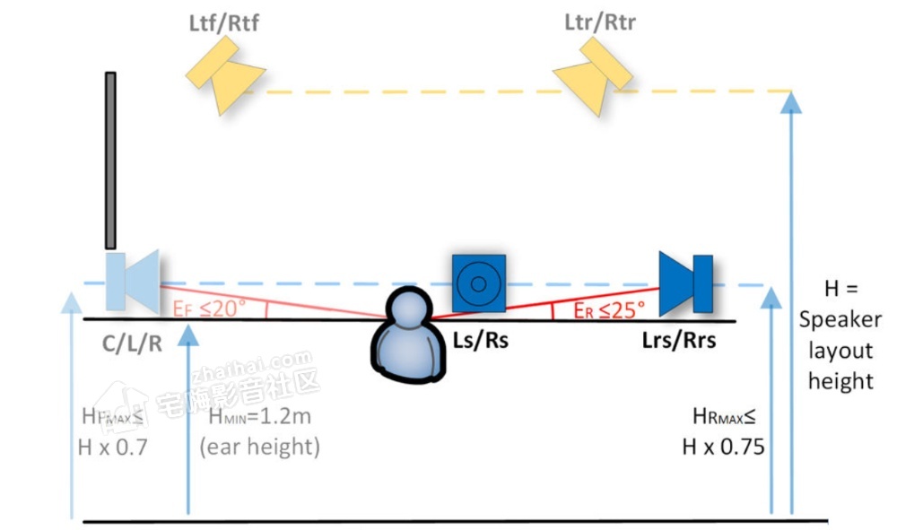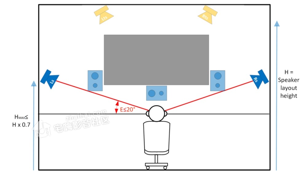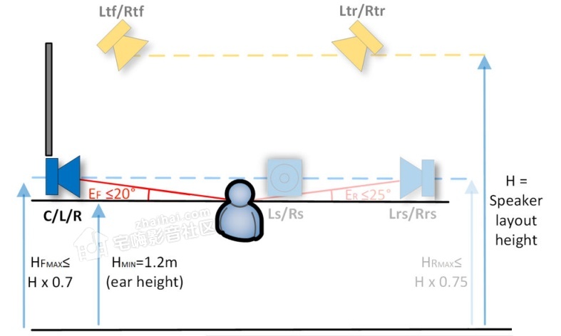 向后環(huán)抱揚(yáng)聲器的仰角不應(yīng)大于25°。 后環(huán)抱高度不應(yīng)大于0.75乘以房間高度。 圖6:顯現(xiàn)后環(huán)抱揚(yáng)聲器位置的側(cè)面仰角圖