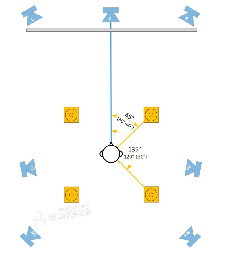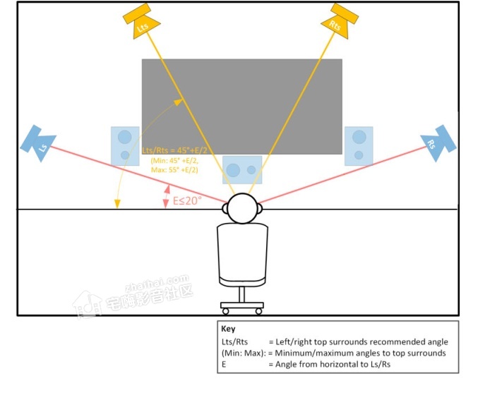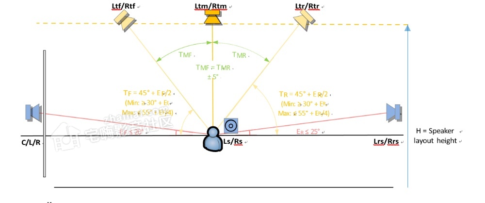 前頂從水平環(huán)抱的理想角度為45˚+(EF ÷ 2),其中EF是屏幕揚(yáng)聲器從水平偏向的仰角。 喇叭應(yīng)當(dāng)放在應(yīng)盡能夠接近理想的位置;可是,倡議的與前頂部環(huán)抱式揚(yáng)聲器相向的角度范圍是: 最小:30˚+EF 最大:55˚+(EF ÷ 4) 后環(huán)抱位置的理想和限制是不異的,只是與后環(huán)抱的角度稱為ER。
