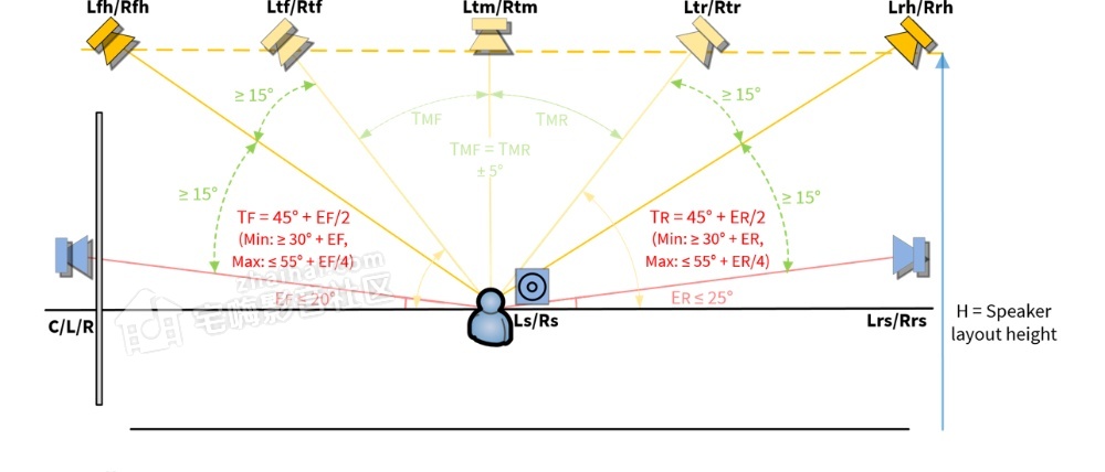 頂置中環(huán)抱揚(yáng)聲器的位置應(yīng)當(dāng)是房間的左右兩半之間存在對(duì)稱性,在混音器的每一側(cè)(這樣每一個(gè)排擠環(huán)抱的橫向角度是不異的)。 在正面立面圖上看到的最小頂置中環(huán)抱位置角為45˚+(E ÷ 2),其中E是側(cè)面從水平偏向環(huán)抱揚(yáng)聲器的位置角。這也是理想角度。 11、增高環(huán)抱式揚(yáng)聲器縱向位置 利用增高環(huán)抱式揚(yáng)聲器并不常見;可是,在某些情況下,它們能夠合適房間設(shè)備。 在利用Lfh/Rfh和Lrh/Rrh的情況下,這些倡議決議了這些附加頂部環(huán)抱聲揚(yáng)聲器的位置: 在挑選附加頂部環(huán)抱揚(yáng)聲器的位置之前,回首一下屏幕、側(cè)面環(huán)抱、后部環(huán)抱以及前后增高環(huán)抱揚(yáng)聲器的理想位置和保舉。有關(guān)具體信息,請(qǐng)參閱房間設(shè)想尺寸、術(shù)語、根本常識(shí)和揚(yáng)聲器結(jié)構(gòu)設(shè)想。 理想情況下,頂部增高環(huán)抱揚(yáng)聲器與其他頂置環(huán)抱揚(yáng)聲器的高度不異。 屏幕揚(yáng)聲器與前增高環(huán)抱揚(yáng)聲器之間的間隔角度應(yīng)最少為15°,如"側(cè)面立面"視圖所示,其中顯現(xiàn)了頂增高環(huán)抱揚(yáng)聲器。一樣,后增高環(huán)抱揚(yáng)聲器與后環(huán)抱揚(yáng)聲器縱向之間應(yīng)當(dāng)有15°的角度。 前增高環(huán)抱揚(yáng)聲器與相鄰頂置環(huán)抱揚(yáng)聲器之間的縱向間距應(yīng)最少為15°,如"側(cè)面高程"視圖所示,顯現(xiàn)頂增高環(huán)抱聲揚(yáng)聲器。一樣,后部增高環(huán)抱應(yīng)最少有15°的角度揚(yáng)聲器和相鄰的增高環(huán)抱揚(yáng)聲器縱向。 要建立X.1.8結(jié)構(gòu),請(qǐng)利用Lfh/Rfh或Lrh/Rrh對(duì)。對(duì)于X.1.10結(jié)構(gòu),同時(shí)利用Lfh/Rfh和Lrh/Rrh對(duì)。