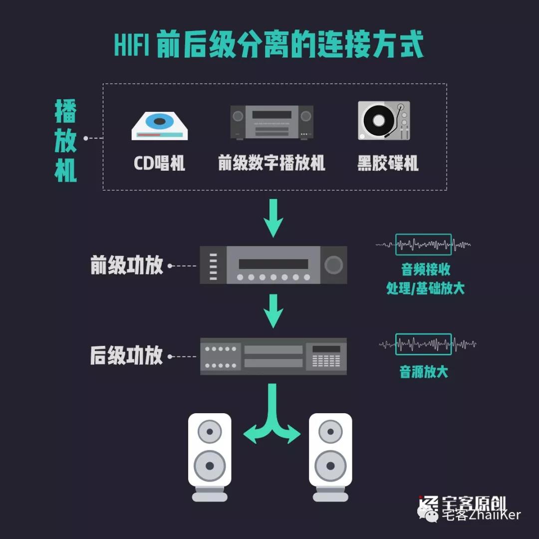 無論是 Hi-Fi,還是 A/V ,兩者的功放都有分前級功放、后級功放以及合并功放。