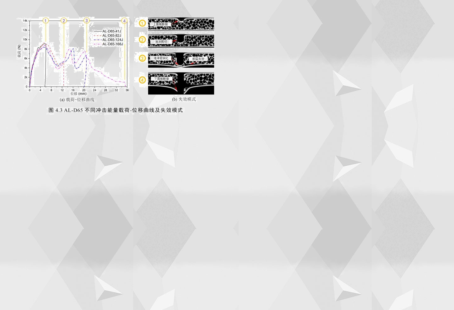 從圖4.3中AL-D65在166J沖擊能量下的載荷-位移曲線可以看出,其曲線有三個(gè)峰值載荷,結(jié)合各沖擊能量下的失效模式可以看出,AL-D65與AL-F2的失效機(jī)理有一定程度的相似性,兩者均是由于上面板裂紋的出現(xiàn)導(dǎo)致第一次峰值載荷下降以及下面板裂紋的出現(xiàn)導(dǎo)致最后一次峰值載荷下降,并且都由于泡沫芯層的密實(shí)化導(dǎo)致載荷在第一次波谷后繼續(xù)上升;而不同之處在于,AL-D65的下面板與膠層之間出現(xiàn)失效分離,如圖4.3(b)中③所示,再結(jié)合AL-D65的載荷-位移曲線可以看到,②與③之間存在一個(gè)峰值載荷,而導(dǎo)致AL-D65第二個(gè)峰值載荷下降的原因是由于下面板與膠層之間出現(xiàn)失效分離。